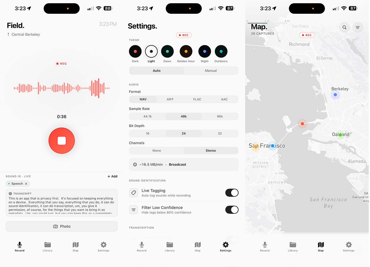 I built Field. because I wanted a recorder that handled the context automatically — location, weather, ambient sound identification, a live transcript of whatever I was saying out loud — so I could stay present instead of managing the tools.