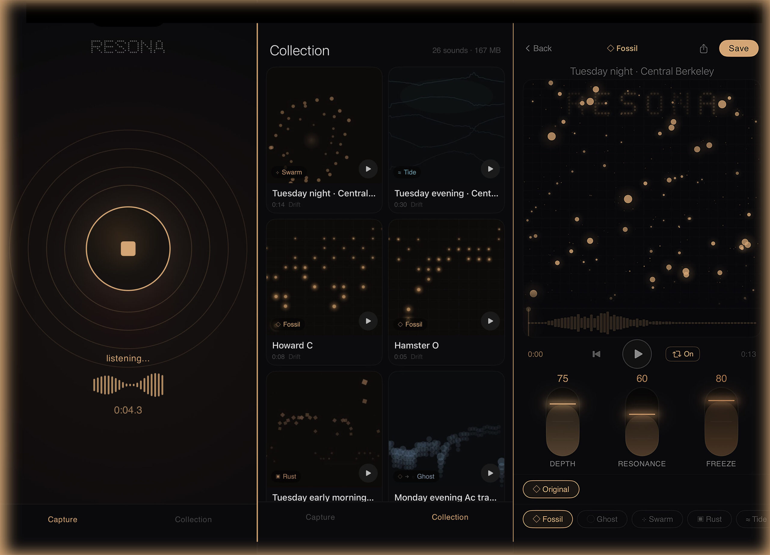 Art filters for sound. Resona captures the sounds around you — a room, a street, rain on glass — and transforms them through six audio filters that strip, stretch, corrode, and scatter the familiar into something you’ve never heard before.